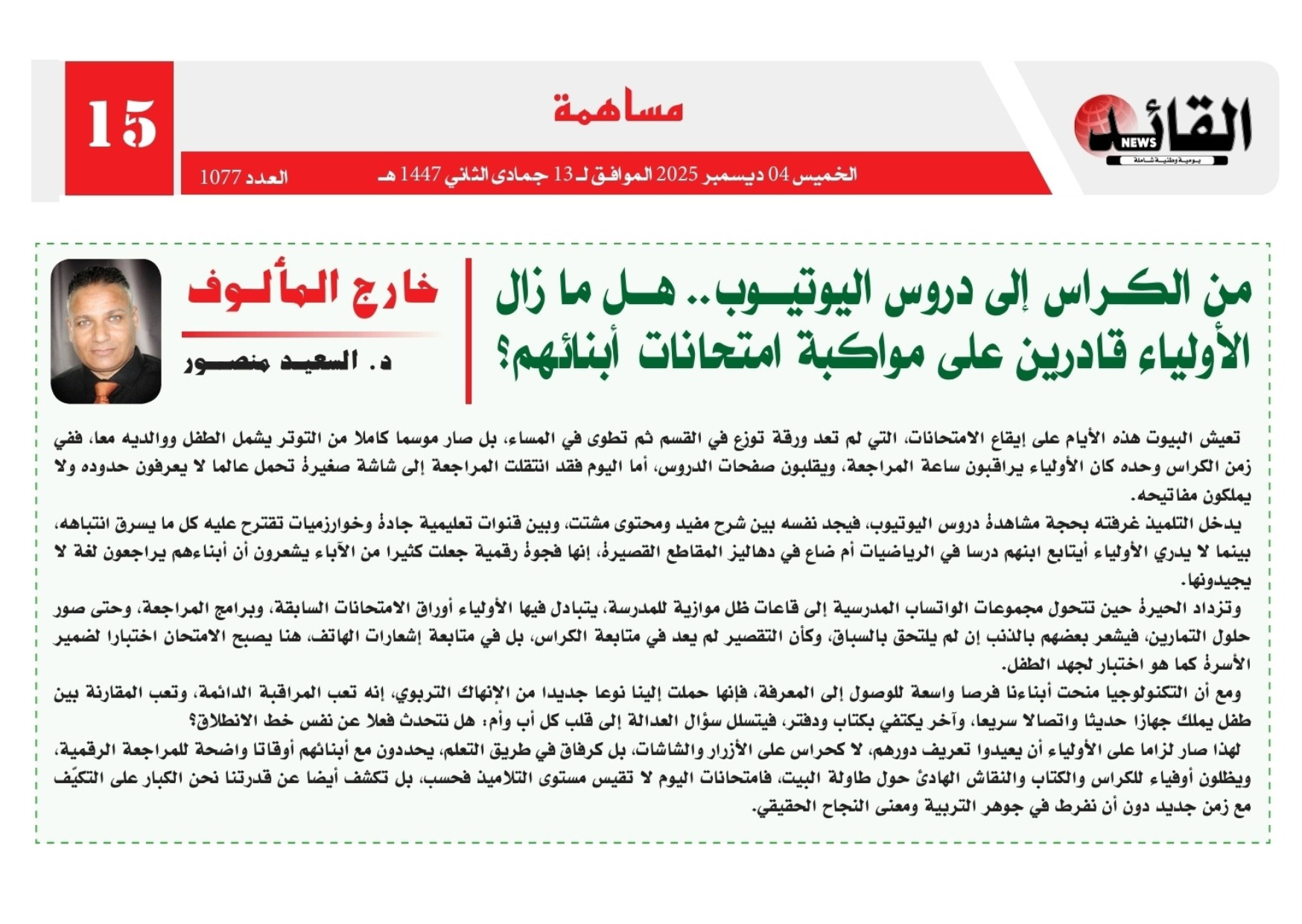 لهذا صار لزاما على الأولياء أن يعيدوا تعريف دورهم، لا كحراس على الأزرار والشاشات، بل كرفاق في طريق التعلم، يحددون مع أبنائهم أوقاتا واضحة للمراجعة الرقمية، ويظلون أوفياء للكراس والكتاب والنقاش الهادئ حول طاولة البيت، فامتحانات اليوم لا تقيس مستوى التلاميذ فحسب، بل تكشف أيضا عن قدرتنا نحن الكبار على التكيّف مع زمن جديد دون أن نفرط في جوهر التربية ومعنى النجاح الحقيقي.